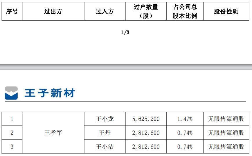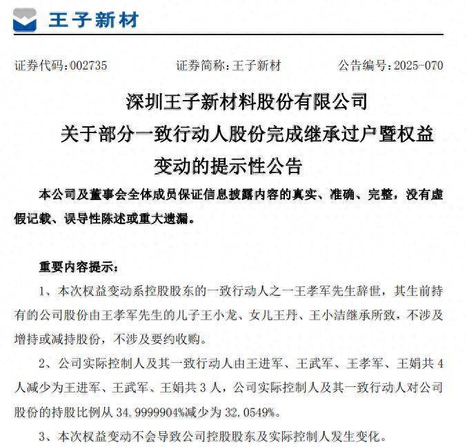 王子新材称,本次权益变动,不会导致公司控股股东及实际控制人发生变更,不会影响公司的治理结构和持续经营,亦不会对公司日常经营活动产生不利影响。自本次继承(非交易过户)完成之日起,王小龙、王丹、王小洁将严格遵守《公司法》《证券法》等法律法规、部门规章及规范性文件中关于股份买卖的相关规定。